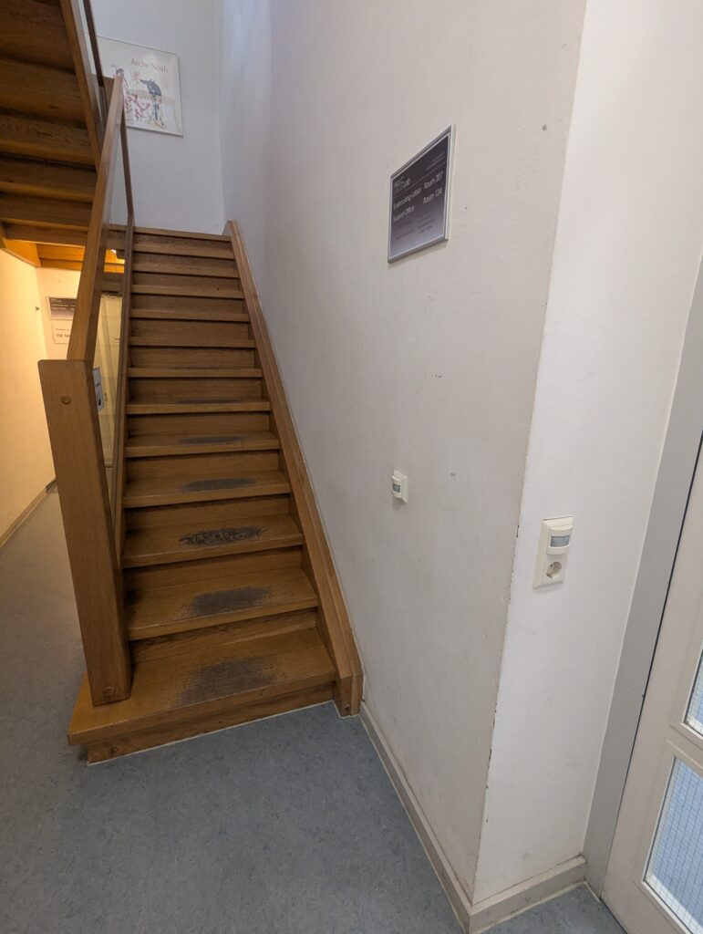 Gehen Sie die Haupttreppe hinauf und treten Sie durch die Tür auf der rechten Seite ein. Gehen Sie die Holztreppe hinauf.