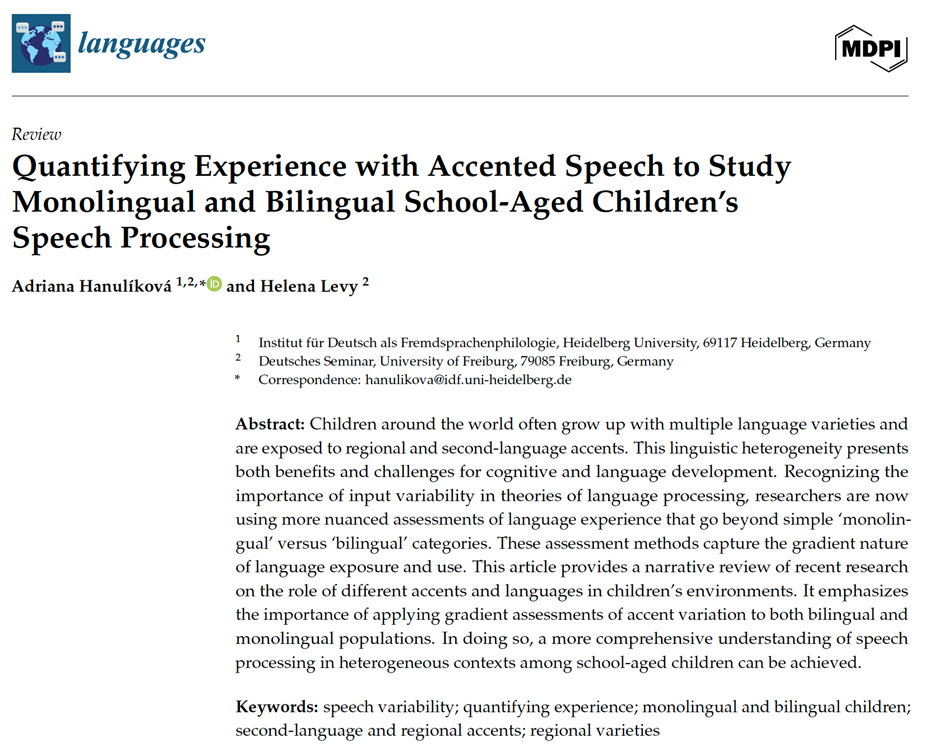 Hanulíková, A., & Levy, H. (2025). Quantifying Experience with Accented Speech to Study Monolingual and Bilingual School-Aged Children’s Speech Processing. Languages, 10(4), 80. https://doi.org/10.3390/languages10040080